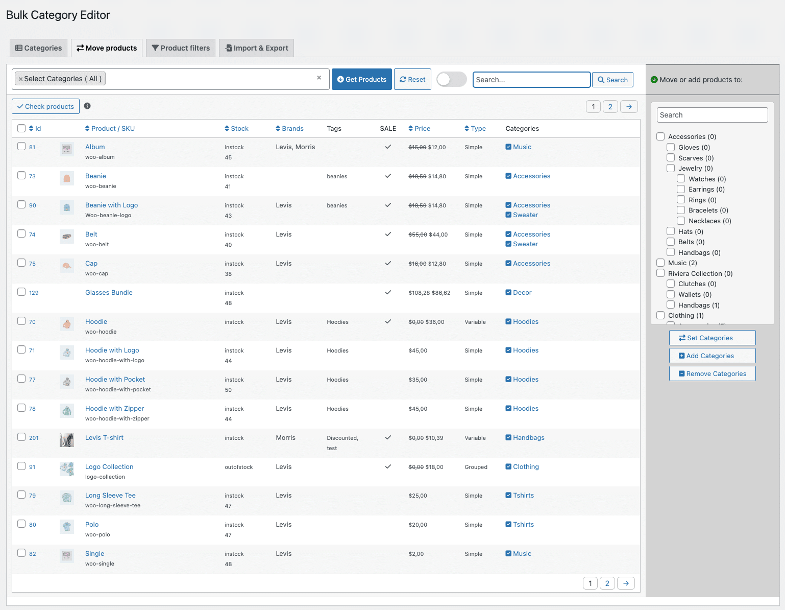 If your products have the wrong categories, perhaps they are stuck in the Uncategorized category. Then we want to remove it from this category and put products in other categories, just go to the move products section. Here you easily find and filter your products and bulk move them to any category or categories. So basically you can: add, set and delete categories for products easy in this section.