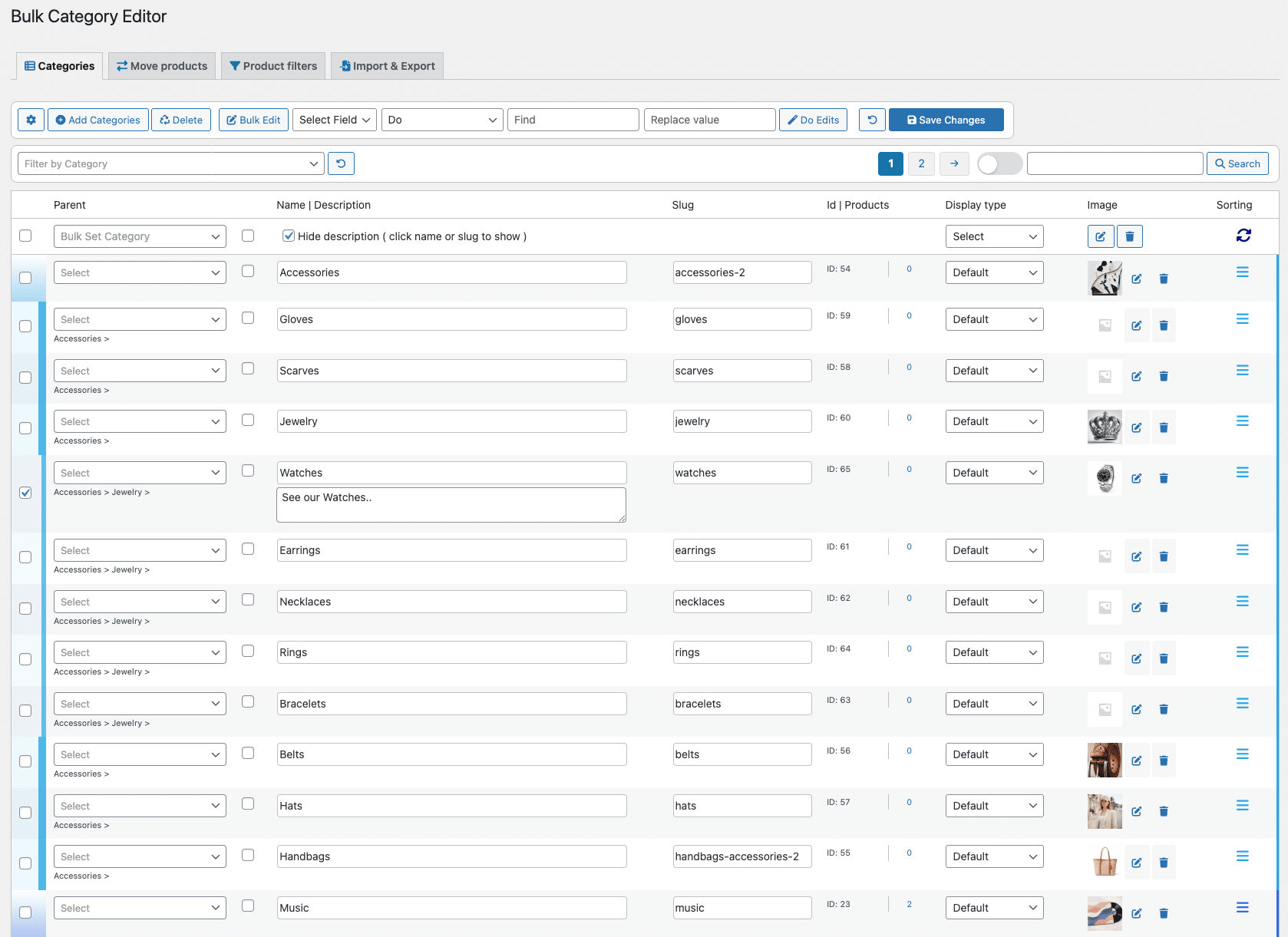 The category search / filter enable you to do searches in the table or database (use the switch to search in the database). If you e.g. filter on your category shoes, then add a space and start typing: “hik”, the result filter down to hiking shoes. The category filter let you search in parent category, name, description and slug. Use the category dropdown filter to get a category (and subcategories) for easy working in a category group.