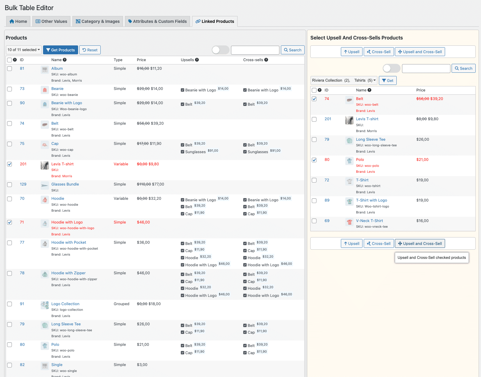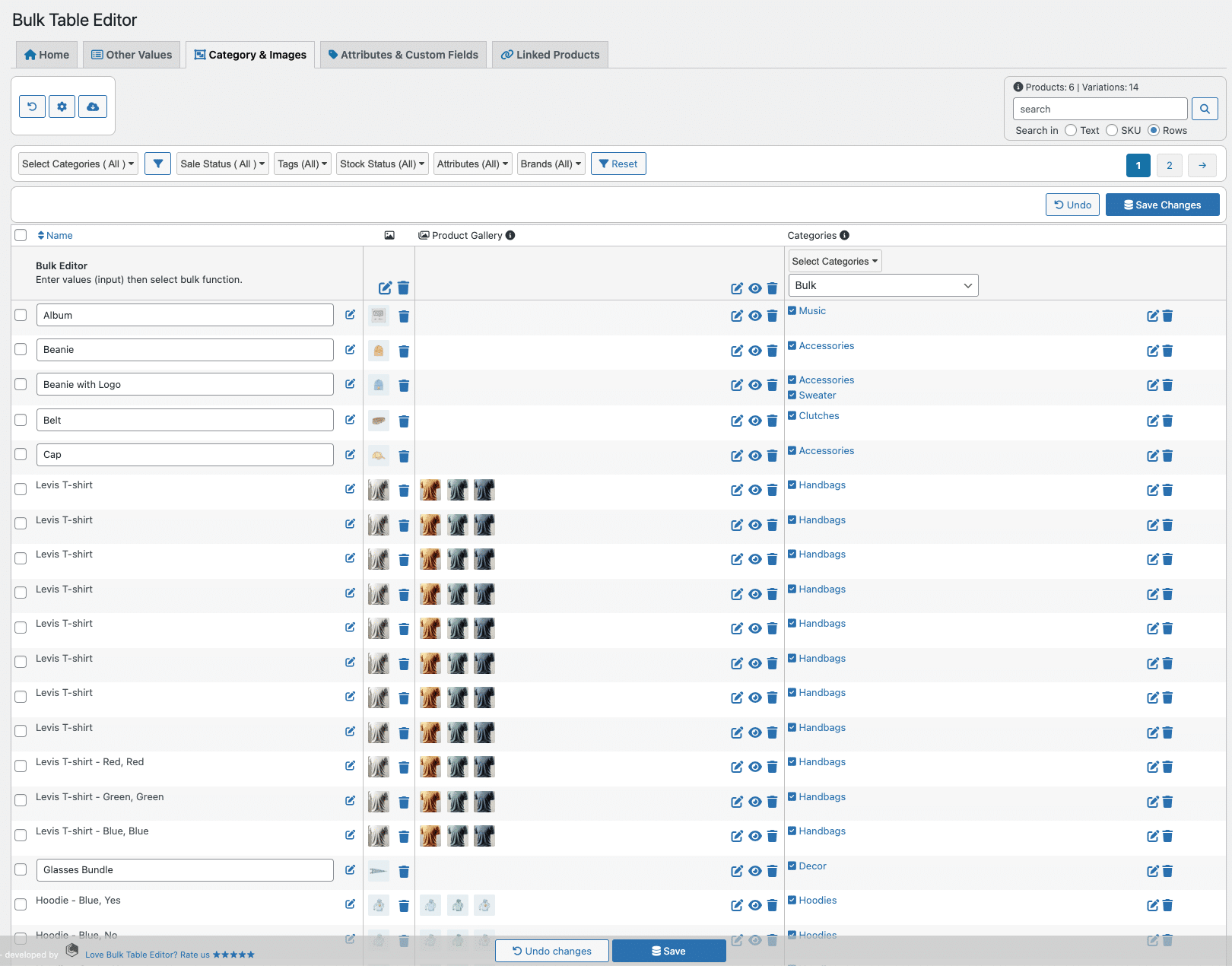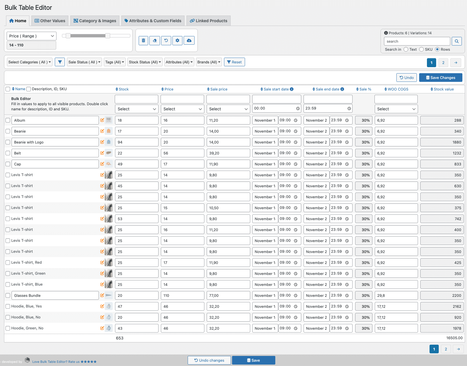 A number of filters are included, several is multi-selects. In addition to filtering by categories, there is an advanced filter in search (rows), a filter for on sale / not on sale, tags filter, stock status, and a range filter. The range filter enables you to get e.g. price range, sale price range and stock range, integrated with the other filters. Once you have found your selection, you can easily bulk update the selection.