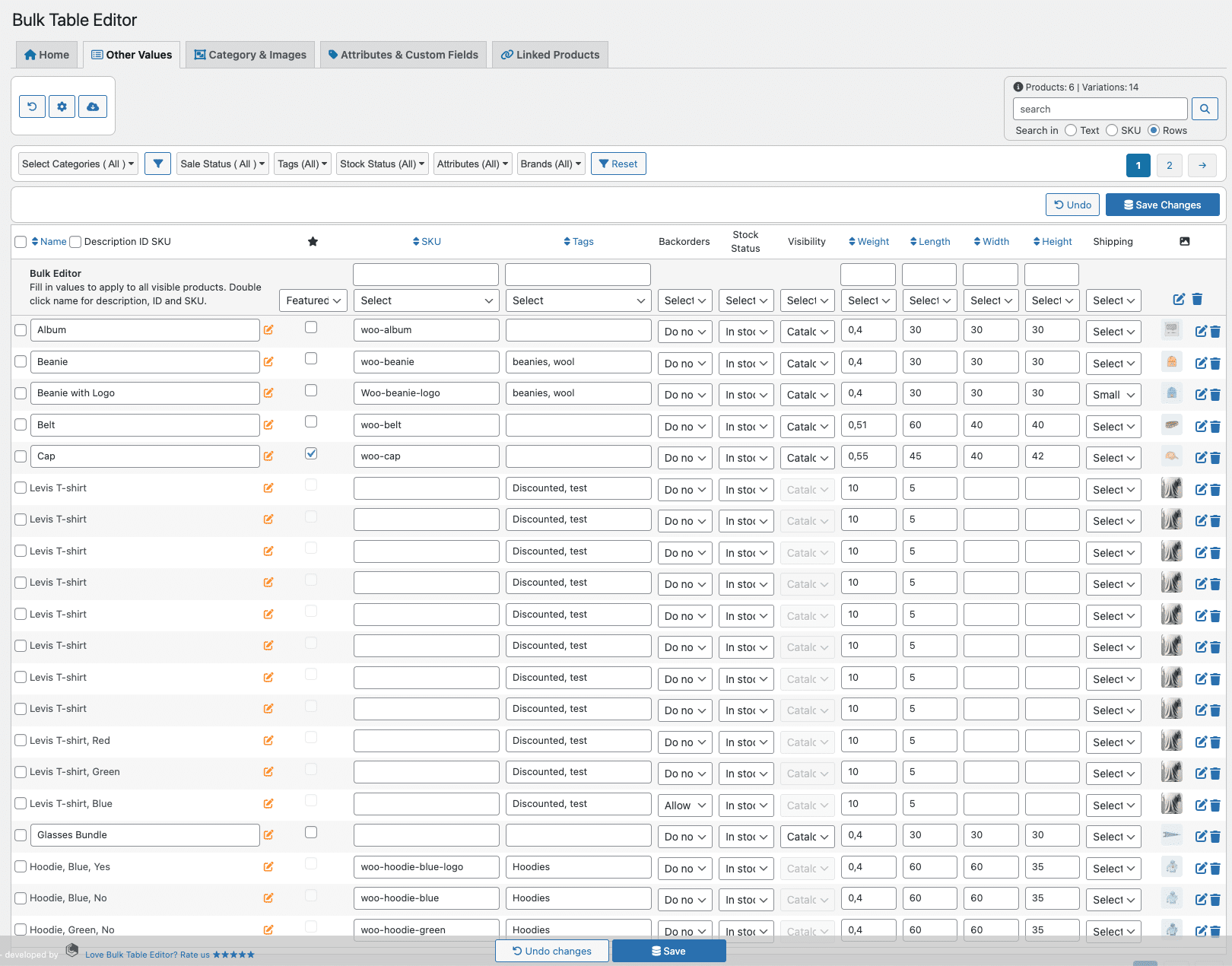Do bulk updates of stock, prices, sales prices, sale dates, SKU, tags, features, backorders, visibility and measurements (weight, length, width, and height). You can take advantage of the many functions like rounding numbers and calculating sales price by percent. Additionally, you can save all of your changes to all selected rows with just the click of a single button.