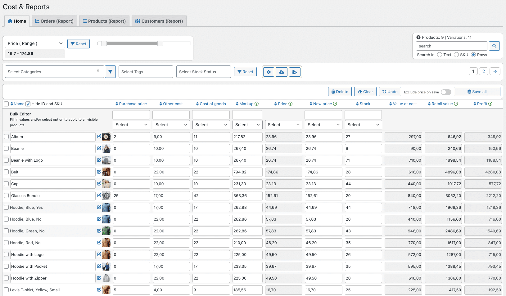 Cost & Reports for WooCommerce gives you clear insight into what you earn on every product and every order. Add purchase prices, extra costs, and WooCommerce’s native Cost of Goods Sold field, then use the built-in table editor to update prices with smart markups.