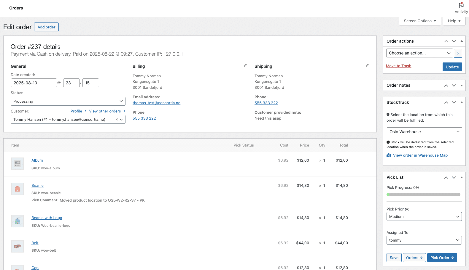 Choose which warehouse fulfills an order directly in the WooCommerce order screen. StockTrack withdraws stock from that location and records the action for complete traceability.