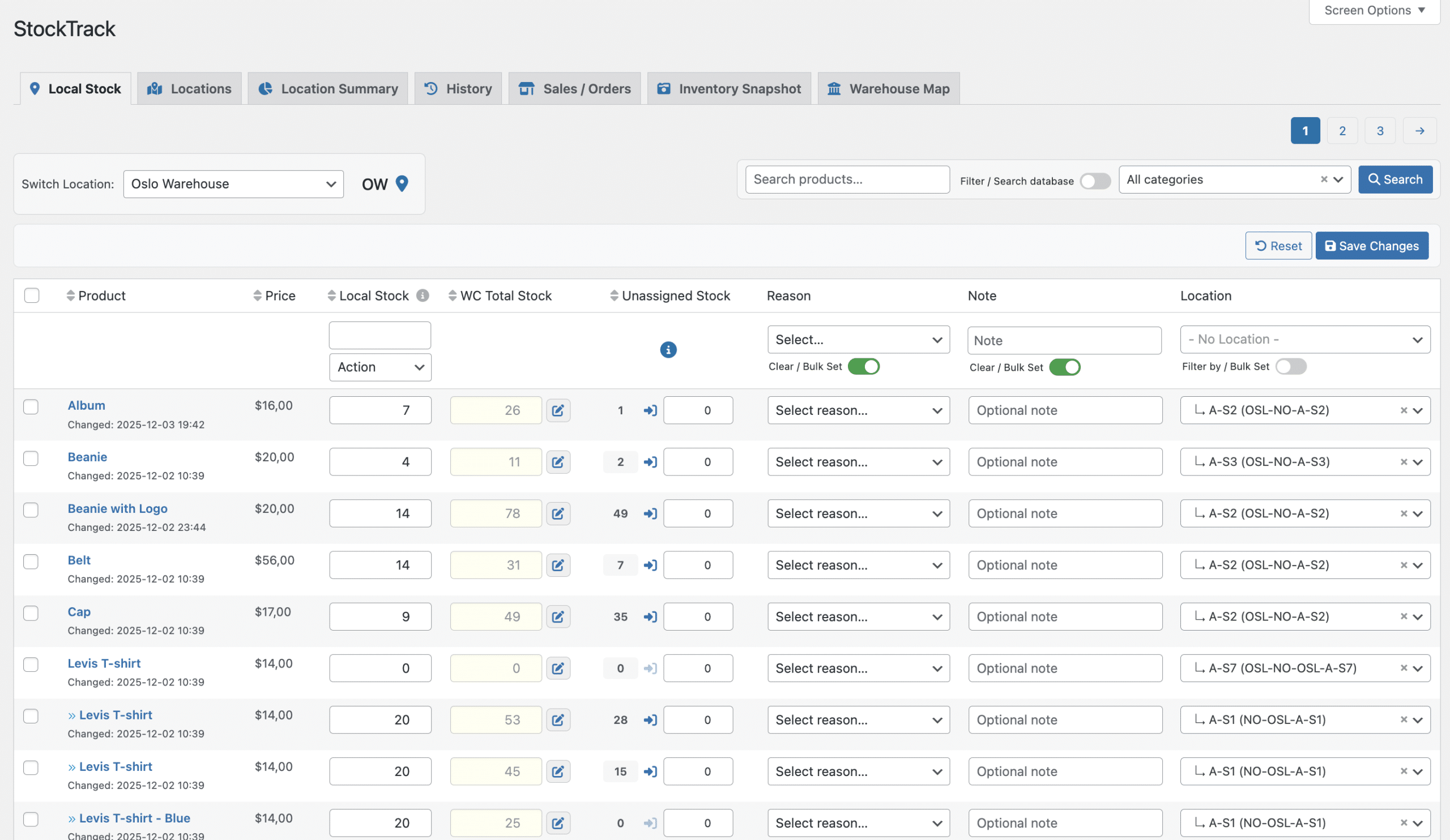 Speed up inventory updates with powerful bulk tools. Set local stock, claim WooCommerce stock, assign locations, clear notes, or apply reasons across hundreds of products at once. Perfect for onboarding new warehouses or performing periodic inventory adjustments.