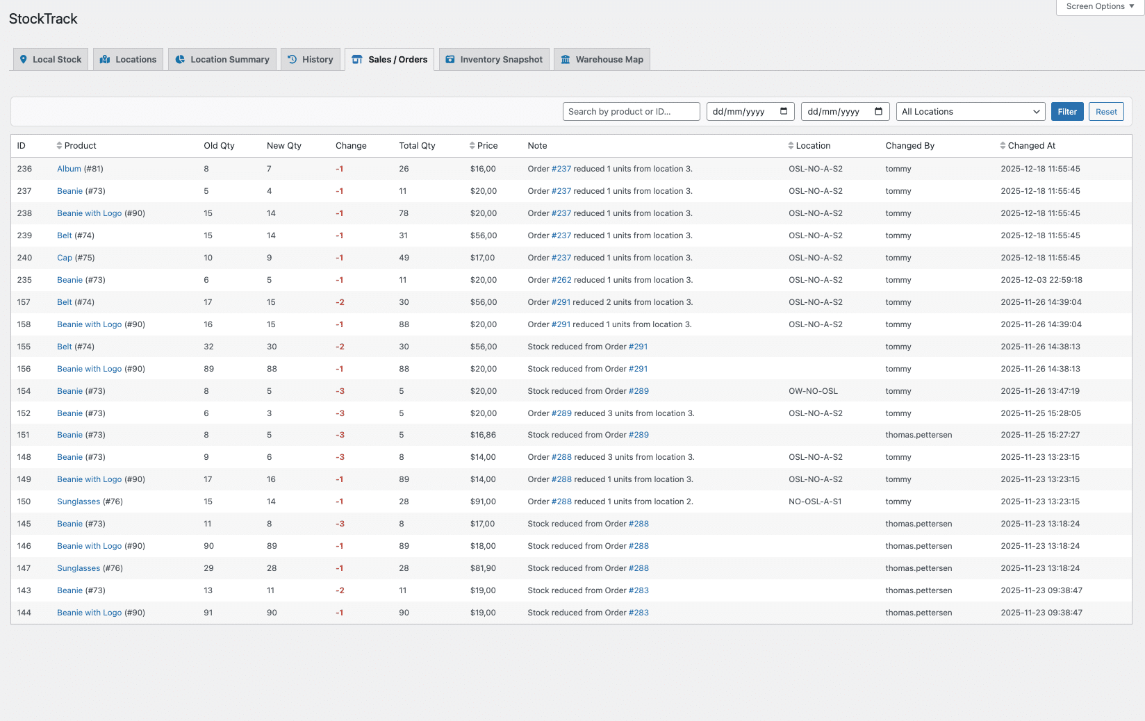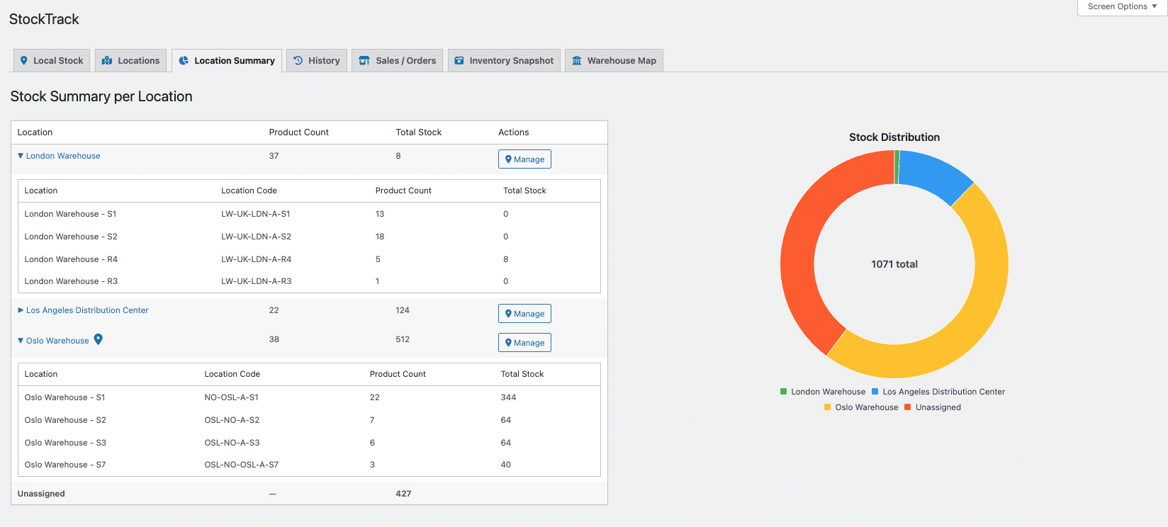 StockTrack gives you location-based inventory inside WooCommerce — with structured warehouse layouts, accurate local stock, full audit trails, order-driven stock deductions, and inventory snapshots with cost and value.
