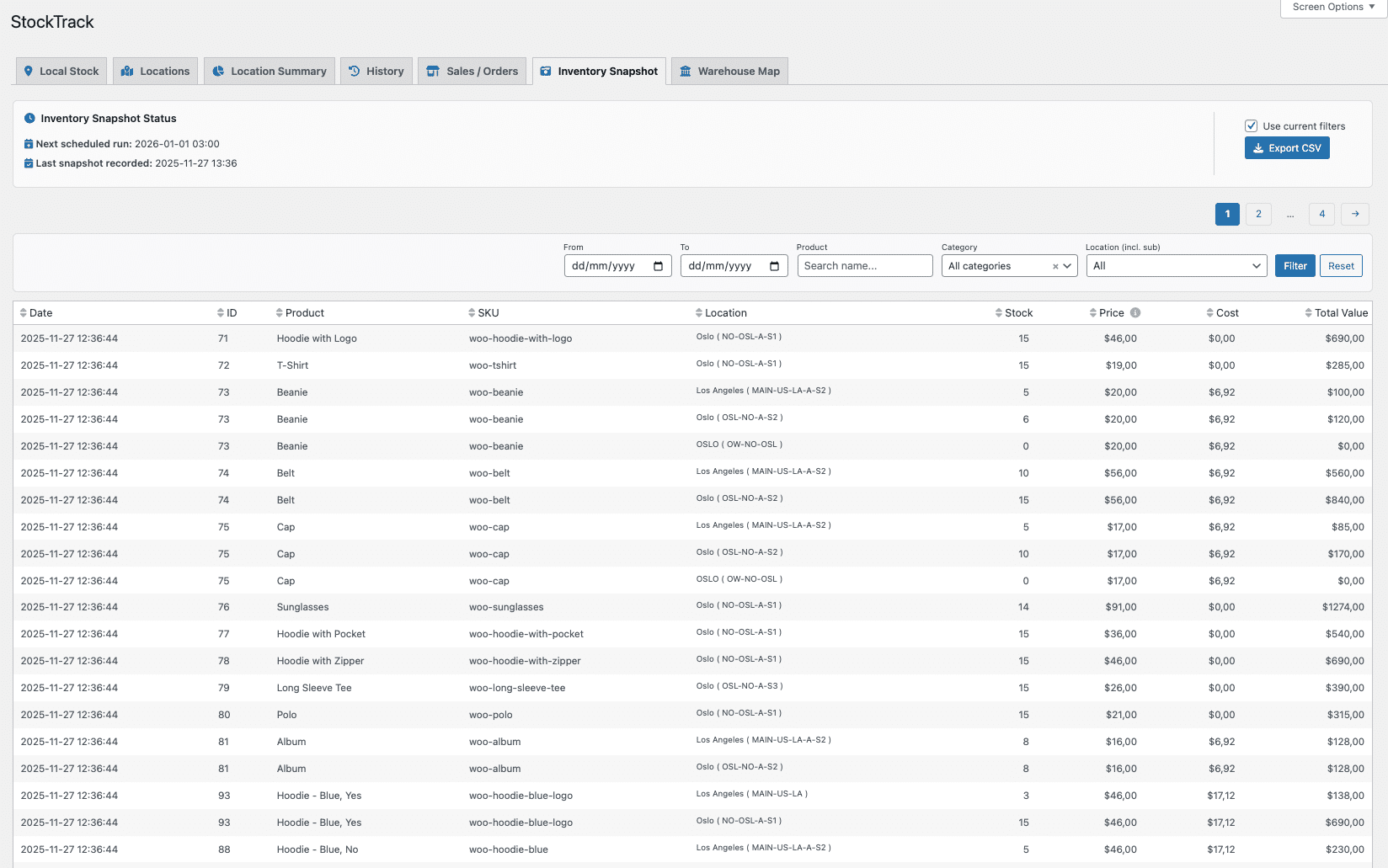 Export snapshots to CSV for accounting, forecasting, BI dashboards, or offline reporting. Bring your WooCommerce inventory into spreadsheets or external tools in seconds.