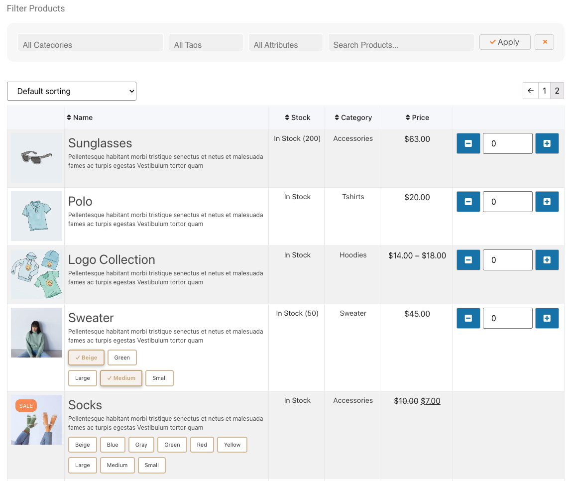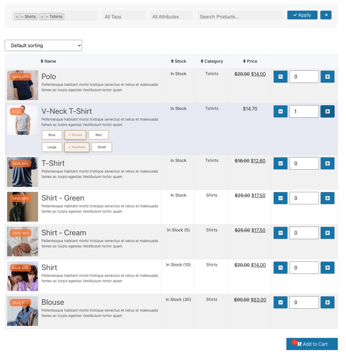 Turn WooCommerce into a bulk order form. Display products in a clean, customizable table with 16+ attributes (sale flashes, categories, add-to-cart, variations as buttons and more). Perfect for large inventories and B2B orders.